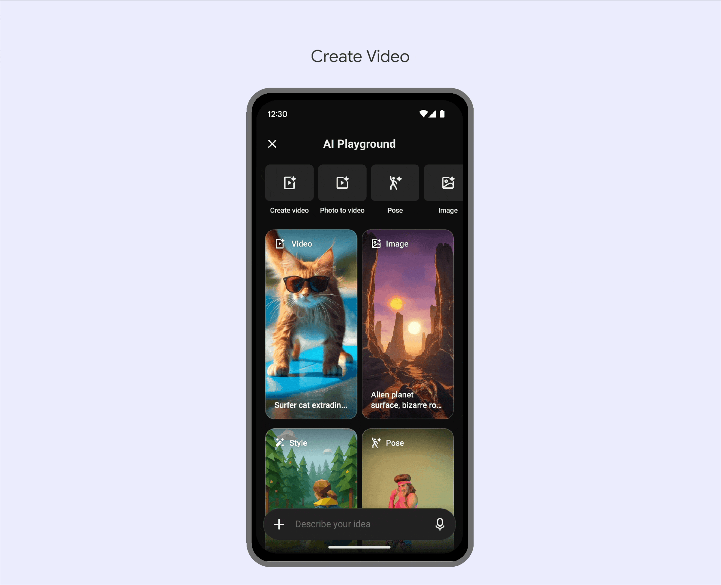 We introduced the AI Playground—a dedicated creation hub within the Shorts camera. At launch, several flag ship features allow creators to instantly generate dynamic, AI-rendered videos or image backgrounds to use in their videos.